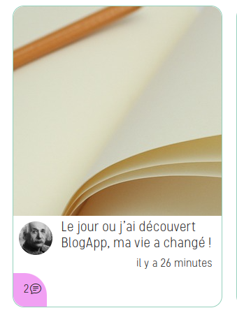 Chaque carte d'article indique son titre, son auteur , depuis combien de temps il a été rédigé et vous pourrez apercevoir en bas à gauche de la carte un encart rose qui vous indique le nombre de commentaires qui ont été postés.