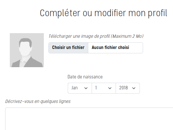 Par défaut votre image de profil est vide. Vous pouvez télécharger une nouvelle image. Attention, elle doit être d'un format image standard (jpg, jpeg, png, webp) et d'une taille de 2Mo au maximum. Vous pouvez égalemet indiquer votre date de naissance et vous décrire en quelques mots. Ces informations apparaîtront lorsqu'un utilisateur cliquera sur votre photo de profil en consultant votre article.