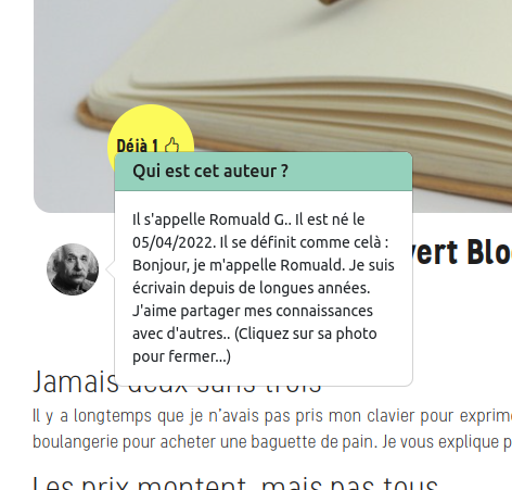 En cliquant sur la photo de l'auteur, vous verrez apparaître les détails qu'il a communiqués. Pour fermer la fenêtre, cliquez à nouveau sur sa photo